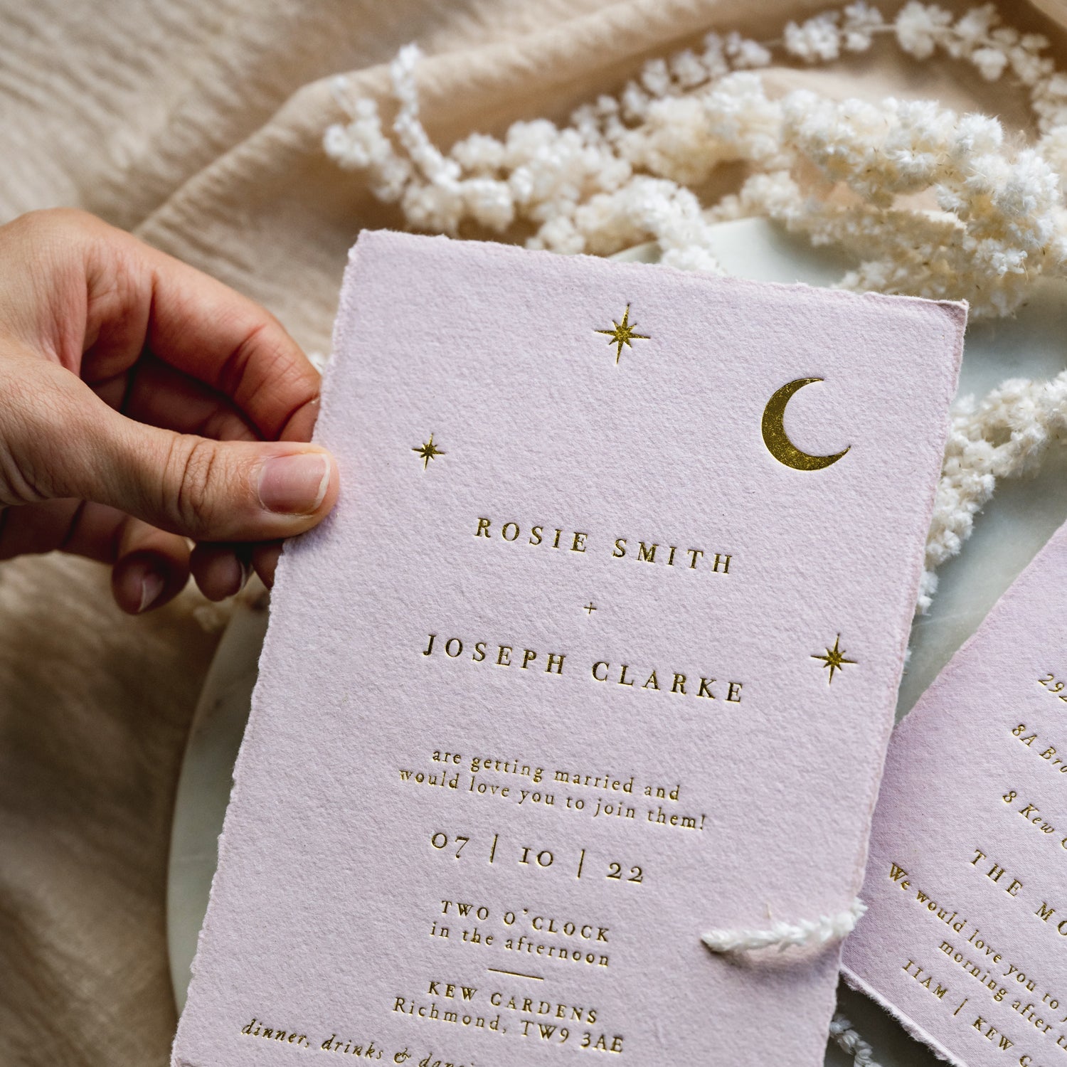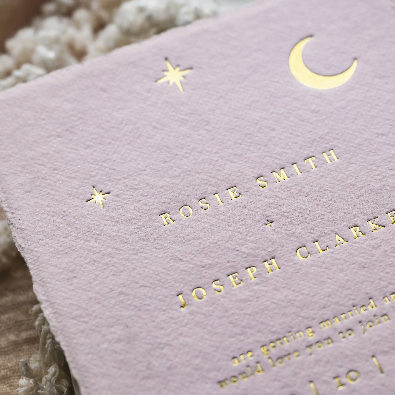 Our best selling invitation design just got that little bit better! The moon & stars collection is now available in full gold foil emboss on handmade blush cotton paper, featuring a delicate deckled edge.